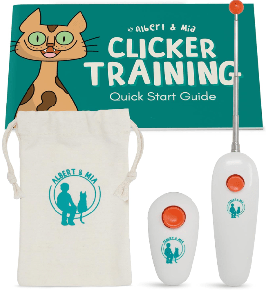 ALBERT & MIA Cat Training Kit (4 Pieces) – Quiet Clicker + Target Stick Clicker + Treats Pouch + Cat Clicker Trainer Start Guide (Beginner to Expert Pet Trainer) – Kitten & Dog Training Clicker Kit