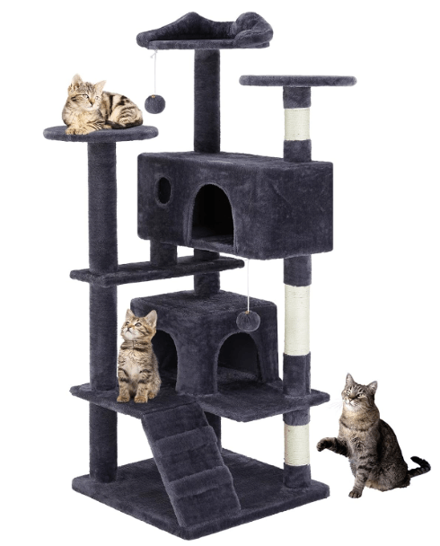 DUMOS 54-inch Indoor Cat Tree Tower –Multi-Level Pet House for Large Cats with 2 Condos, Scratching Posts, Round Platform, Small Ladder, and Toys – Perfect for Cats of All Ages, Dark Grey