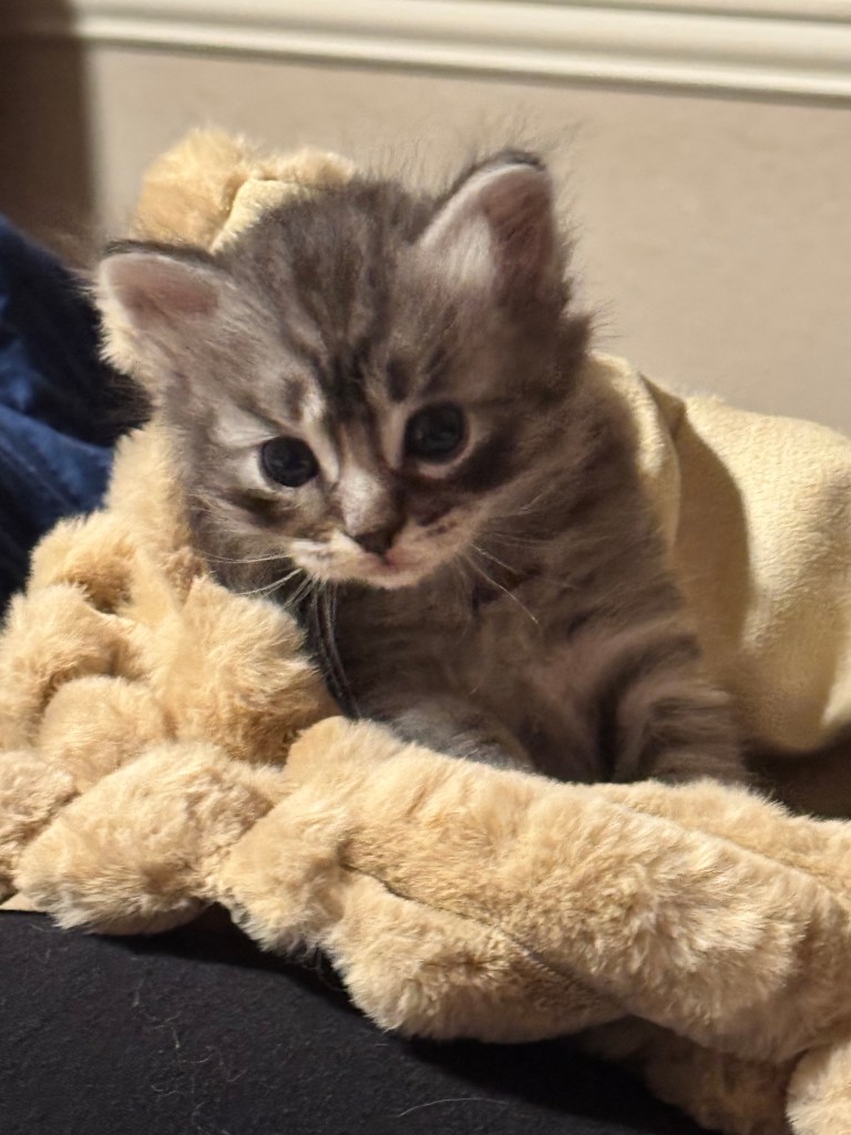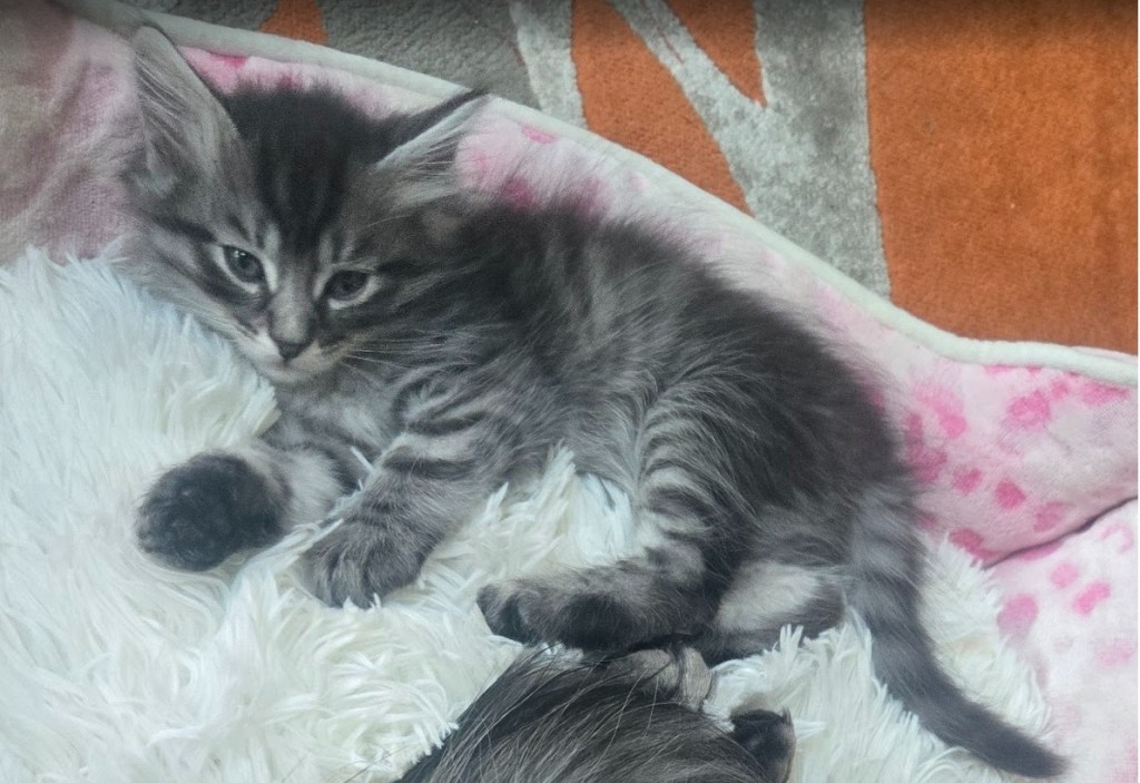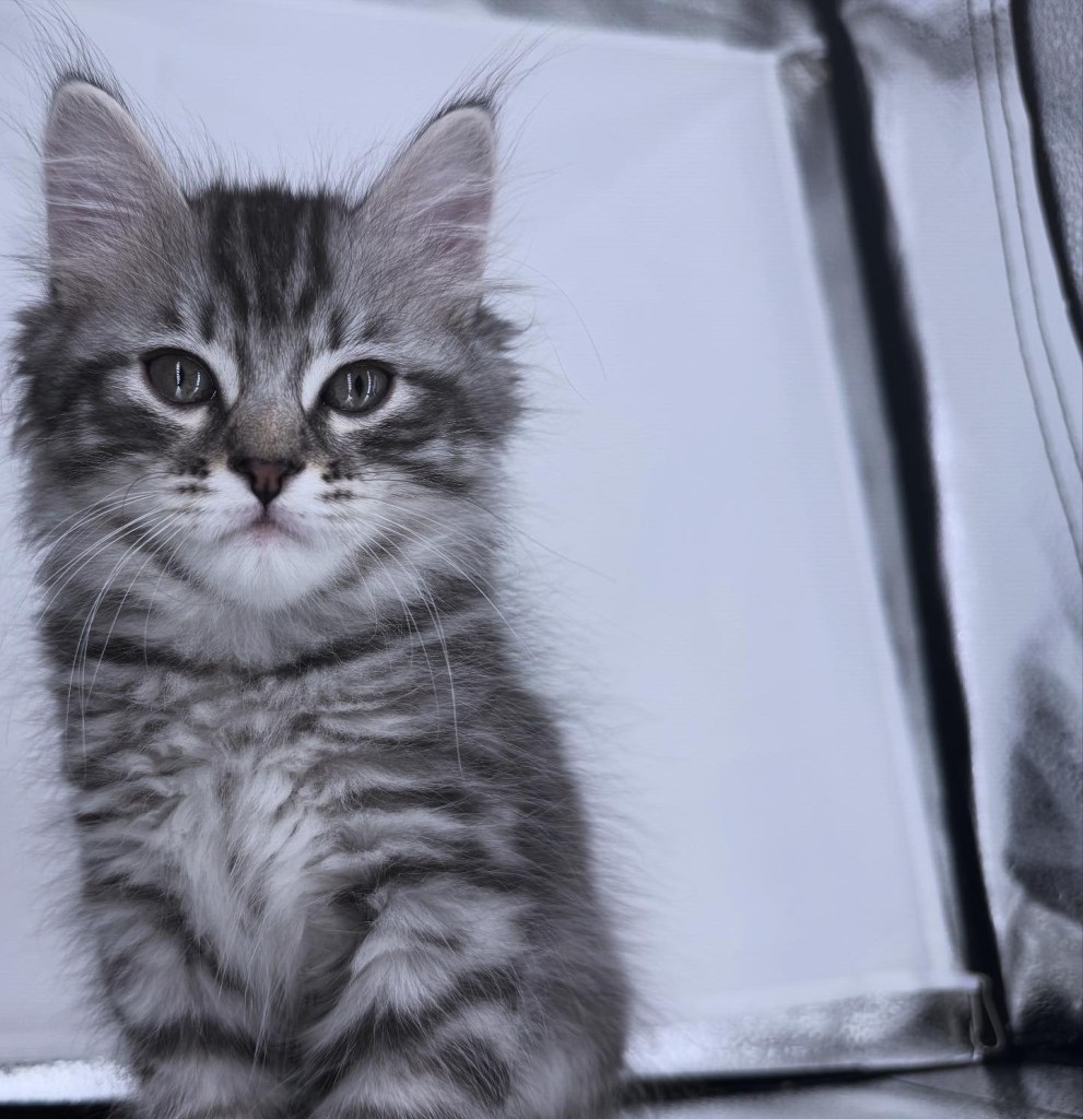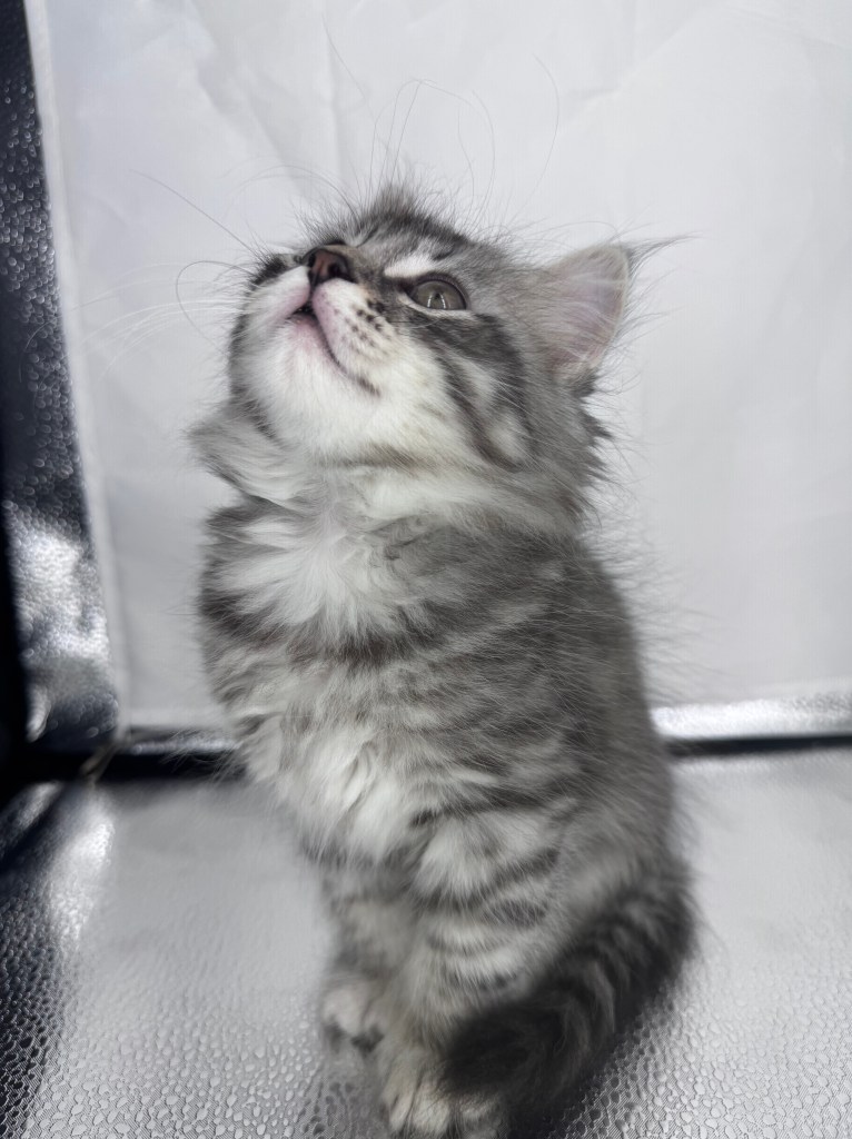 Leo is a stunning Siberian kitten with a light silver tabby coat and soft, snowy facial features that give him an angelic, almost ethereal appearance. His bright eyes and playful spirit light up any room, while his luxurious fur showcases elegant striping and a silvery undercoat that shimmers in the light. Leo’s lighter face gives him a distinctive and regal look compared to his siblings – he’s truly one of a kind! With his gentle personality and show-stopping coat, Leo is the perfect companion for any loving home.