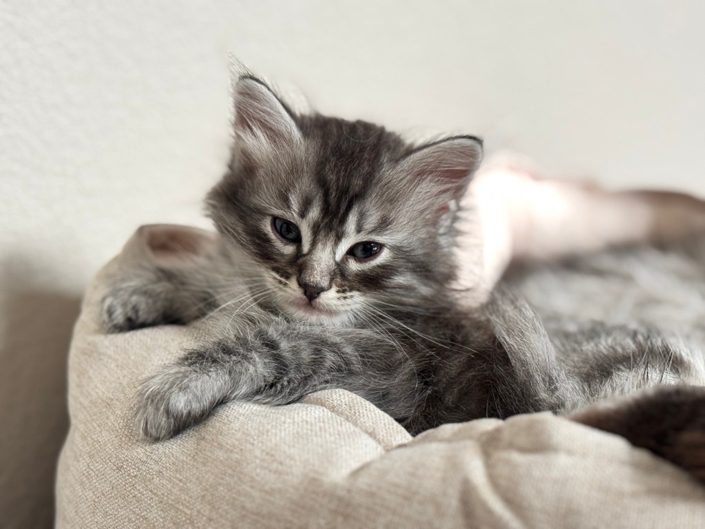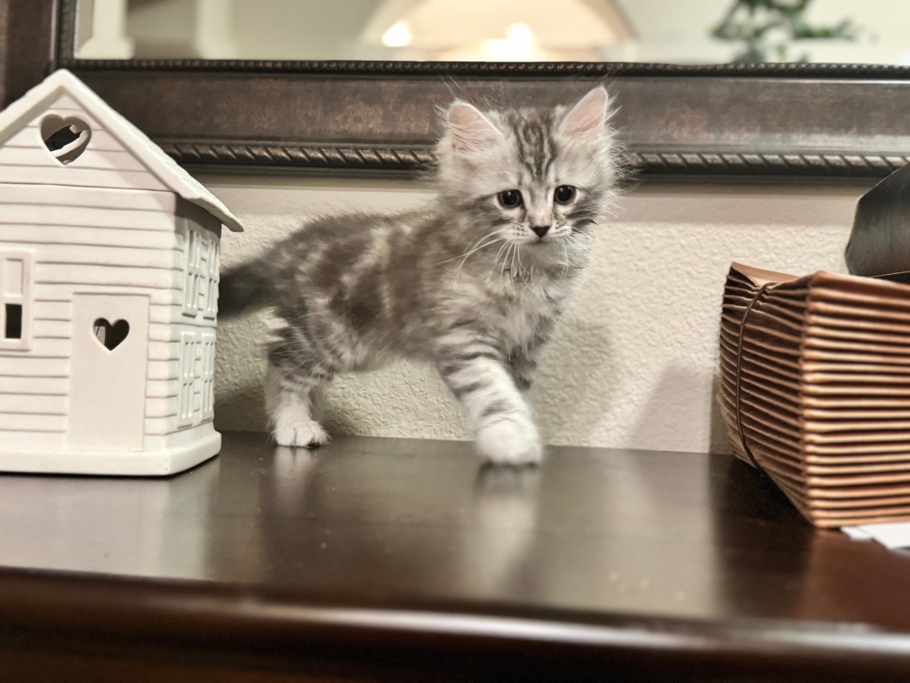 Stripes is a charming male Siberian kitten with striking dark tabby markings and a soft, silvery undercoat that gives him a regal look—even when he’s fast asleep in the most comically cozy positions. True to his name, his bold coat pattern is only matched by his bold personality. Stripes is curious, confident, and always on the lookout for his next mini adventure—whether it’s chasing a feather toy or climbing up for the best nap spot in the house.